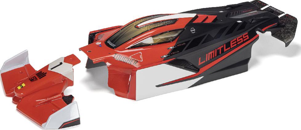 This high-quality polycarbonate LIMITLESS pre-painted bodyshell finished in Red and Black is the perfect replacement for your kit item.