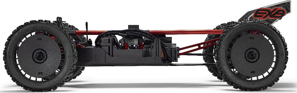The 1/7 TALION 6S EXB RTR was built to handle it all with a laser-etched 7075 T6 aluminum chassis plate, anodized aluminum bulkheads, and heavy-duty composite side guards that can take serious punishment. Stronger diff outdrives front and rear, all-metal gearbox internals, and durable steel driveshafts throughout make the drivetrain as tough as the conditions you'll run it in. Split tower-to-tower center braces, EXB shock towers, and a high-downforce, one-piece wing mount add rigidity and improve handling at speed.