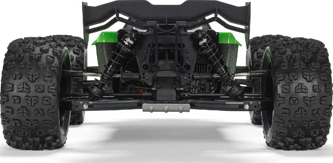 The chassis plate, differentials, front bumper, skid plate, and even the wing mount have all been improved with EXB (Extreme Bash) toughness. New side guards, a two-piece tower-to-tower brace, and inner body tower add more strength and simplify maintenance. The iconic KRATON monster truck body now comes in four striking new multi-color factory finishes, and has a convenient, quick-release, clipless body retention system.
