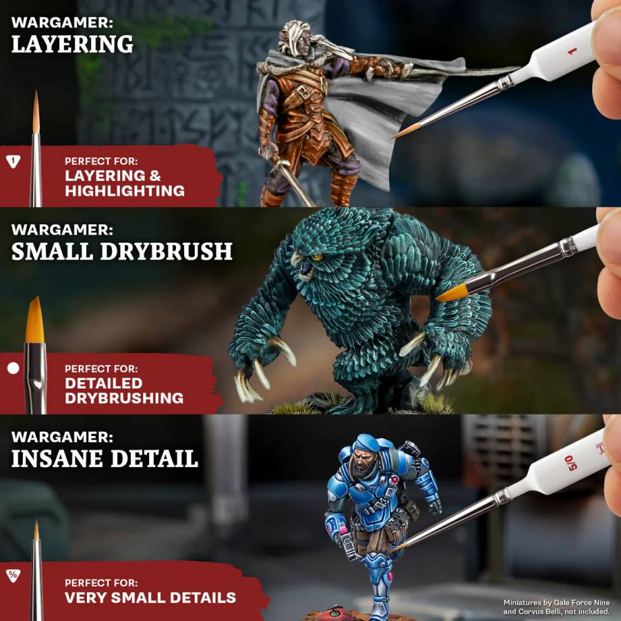 The Most Wanted Set has the Wargamer brushes you need to basecoat, layer, and highlight your miniatures, now in eco-friendly packaging—a small change that makes a big difference.
