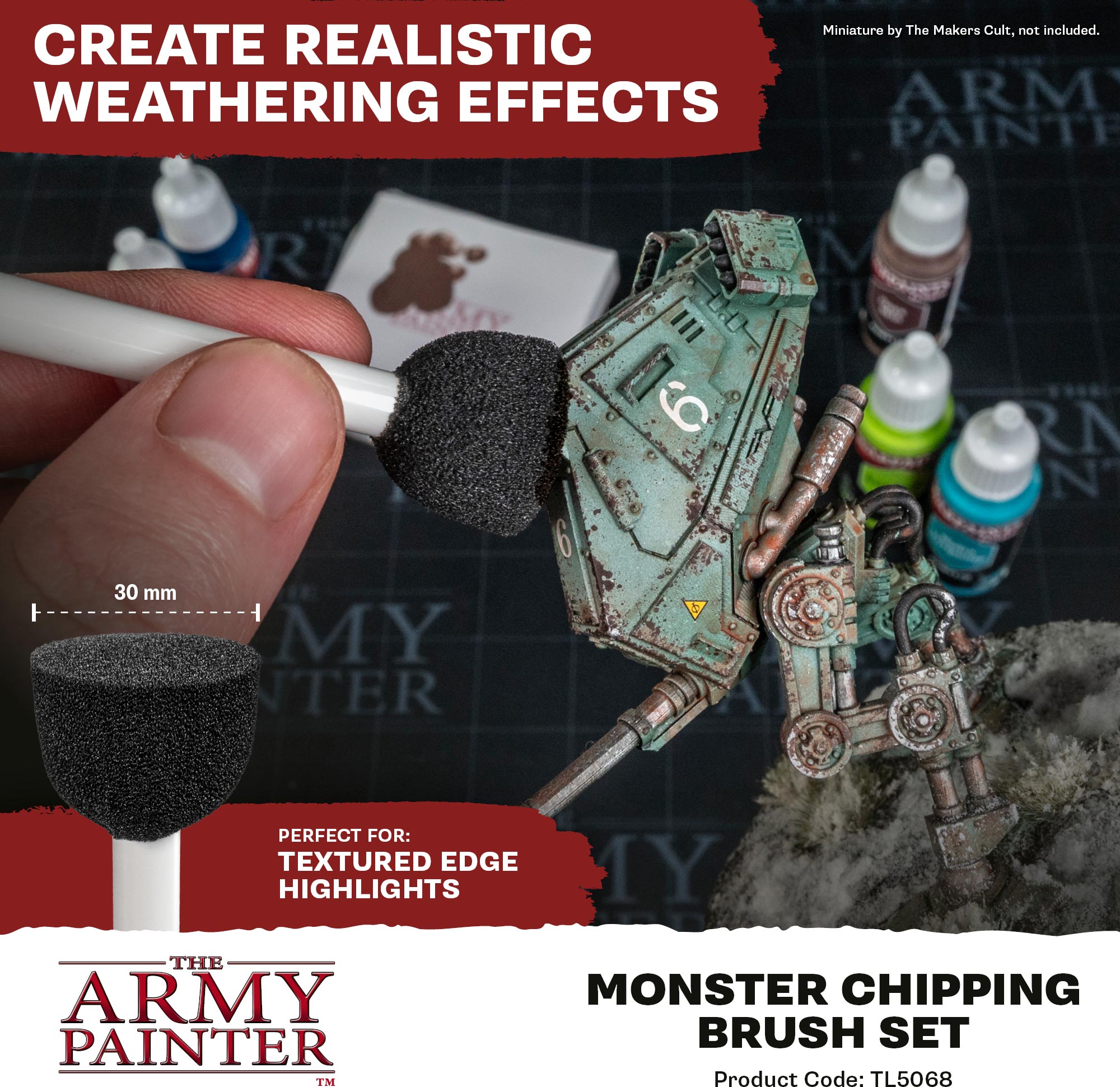 Weather big surfaces fast—without losing control. Firm, durable foam tips break paint naturally for realistic chips, scuffs, and abrasion across large panels and edges. Perfect for tanks, walkers, buildings, and terrain pieces.