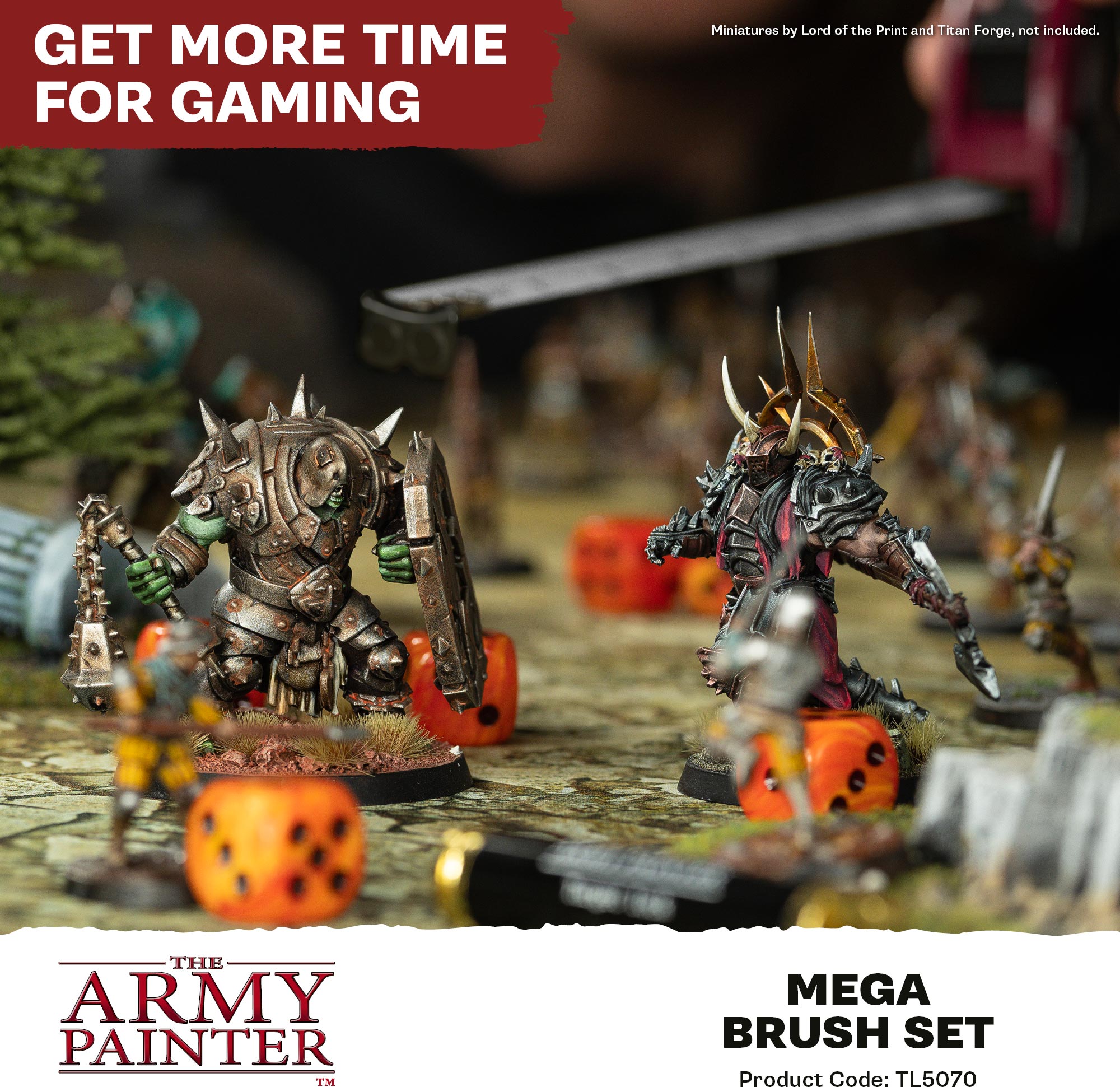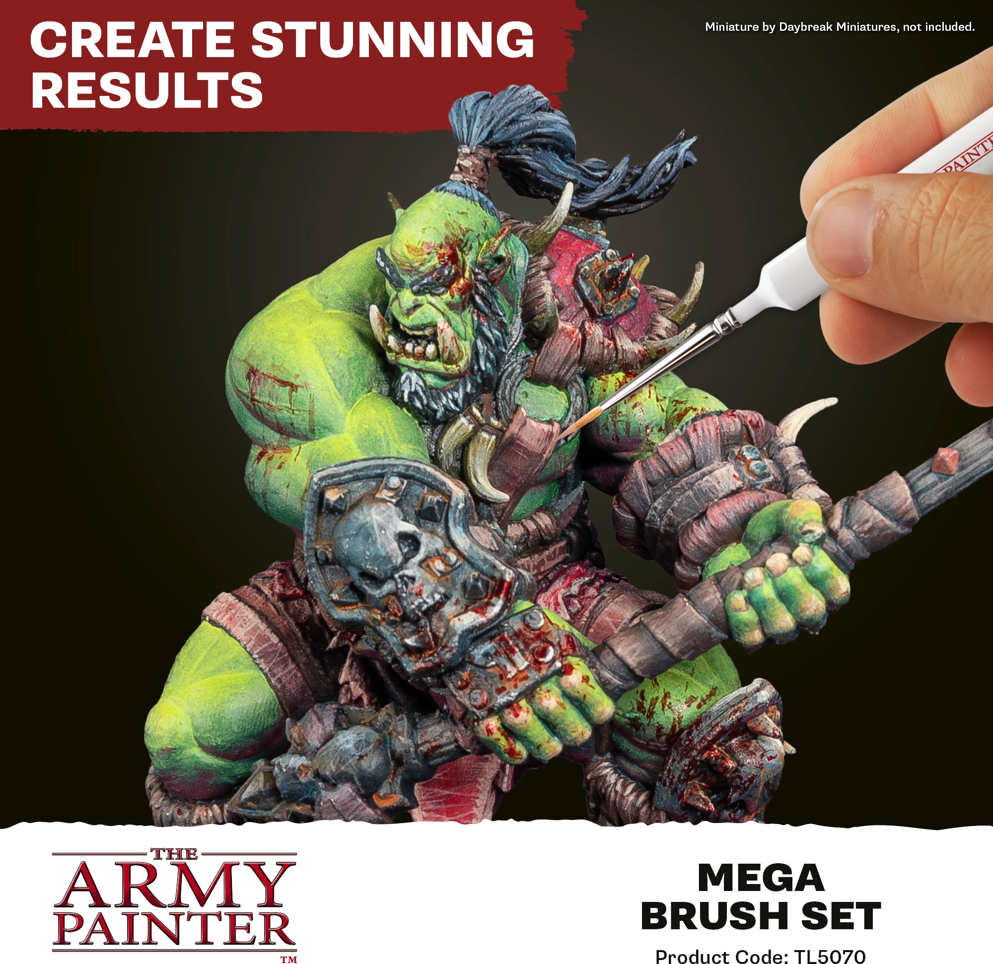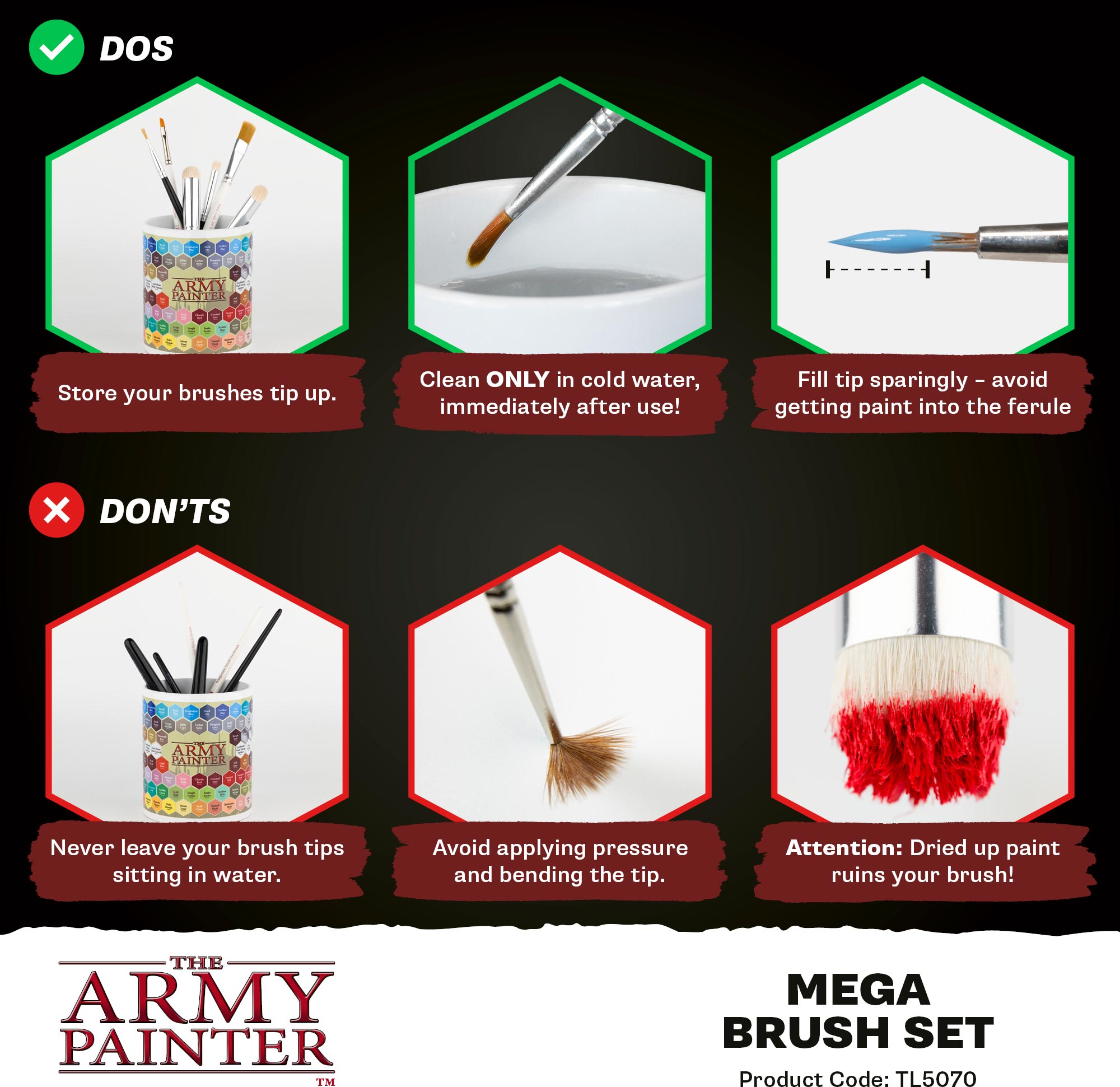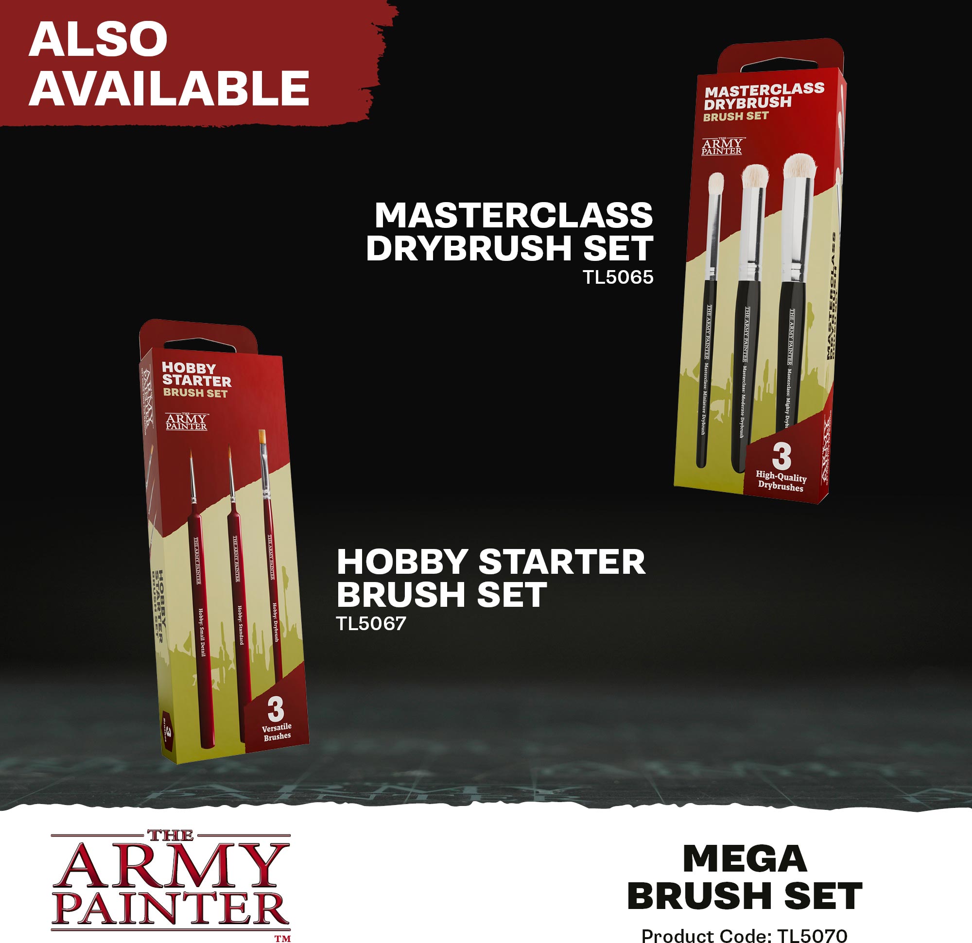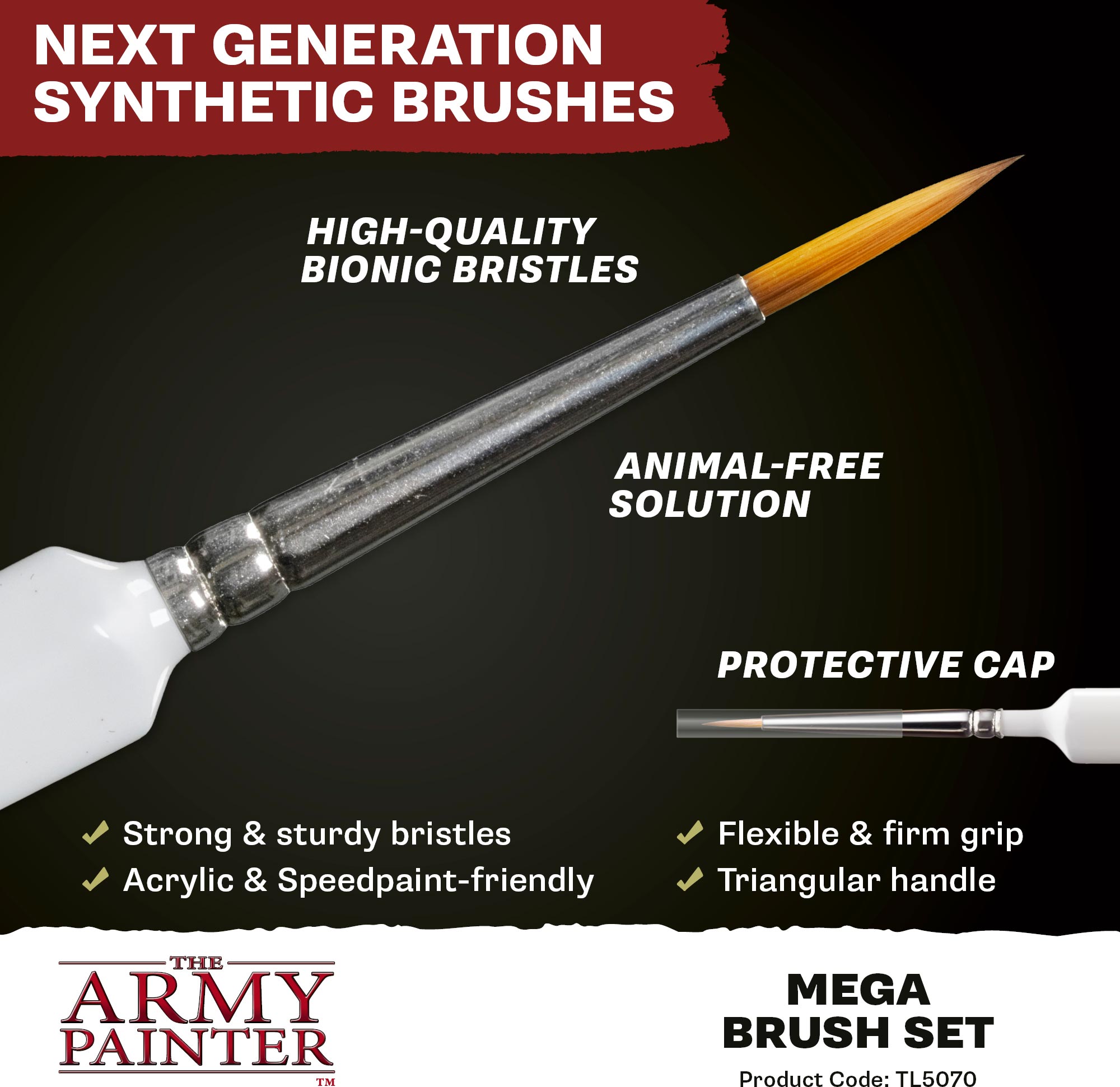 Everything you need to paint anything. The Mega Brush Set brings together our most-used brush types—detail, layering, basecoating, and drybrushing—so you can move from tiny symbols to vehicles and terrain without missing a step. Durable, easy-to-control bristles keep their shape and deliver smooth coverage. Packed in updated, eco-friendly packaging that keeps your tools organised between sessions.