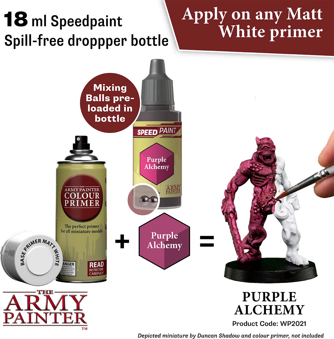 Before using Speedpaints, Army Painter recommends priming your miniatures with Colour Primer Matt White, Colour Primer Brainmatter Beige or Colour Primer Ash Grey to achieve your most vibrant results. However, you can also experiment with other Colour Primes like Necrotic Flesh, Skeleton Bone, or Gun Metal etc. to achieve other cool effects.
