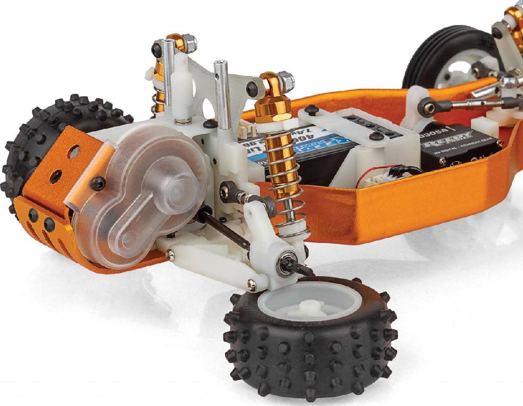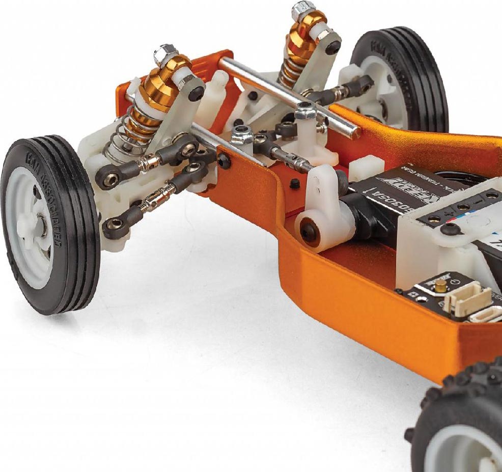 Long-throw, fluid-filled racing shocks deliver smooth, controlled damping, while the lightweight yet rugged suspension provides real adjustability just like larger counterpart race buggies. The A-arm design allows precise tuning of camber, ride height, and spring rates, and an adjustable gear differential ensures balanced power delivery.