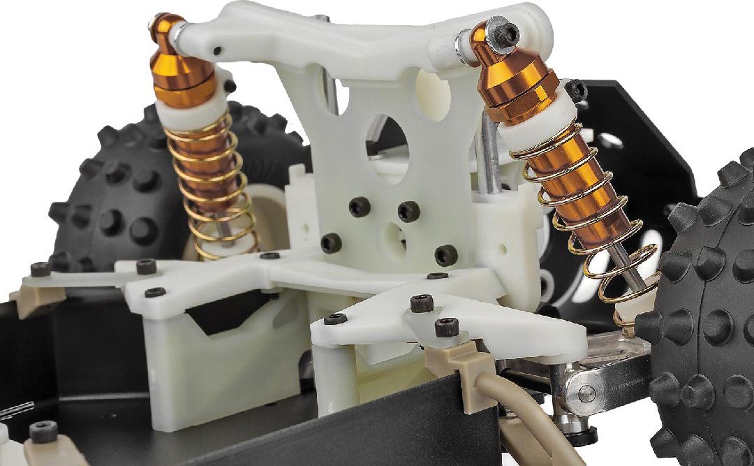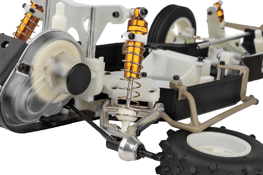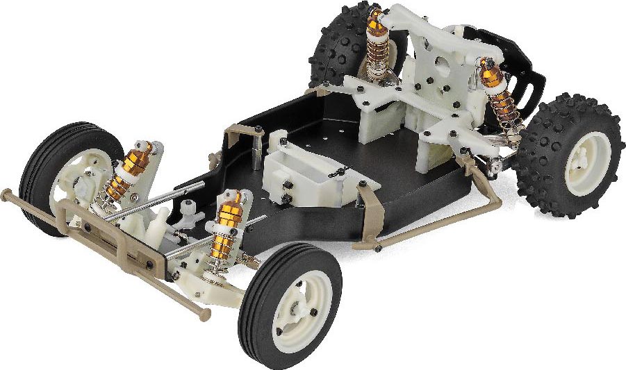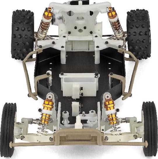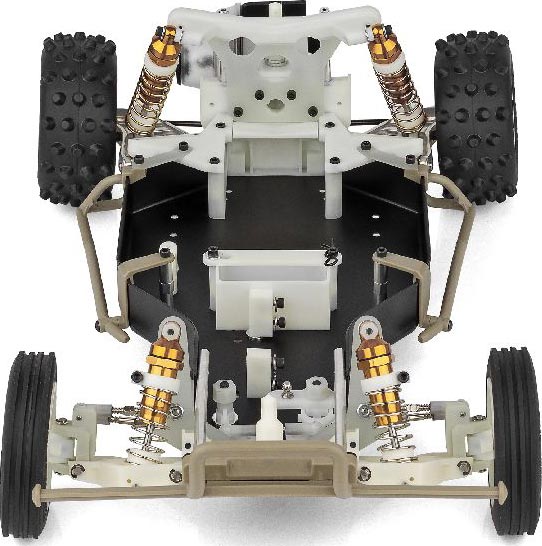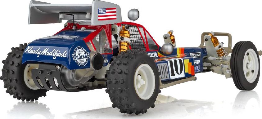 High-end details complete the package, including threaded steel turnbuckles for precise adjustability, gold anodized aluminum long-travel shocks for classic performance and looks, and a factory-correct Protech body set with authentic decals that capture the unmistakable spirit of the box art imagery.