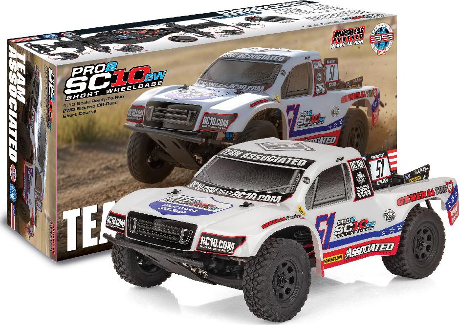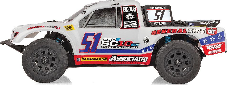 Team Associated’s new Pro2 SC10SW short course truck is a detailed and fun-to-drive Ready-to-Run RC truck. Based on our championship-winning Short Course truck, the Pro2 SC10SW features some of the latest features in racing. A durable lightweight aluminum top shaft, rugged steel turnbuckles and adjustable suspension geometry give the Pro2 SC10SW the ultimate in handling on all terrain. This makes it a perfect platform for short course racing!