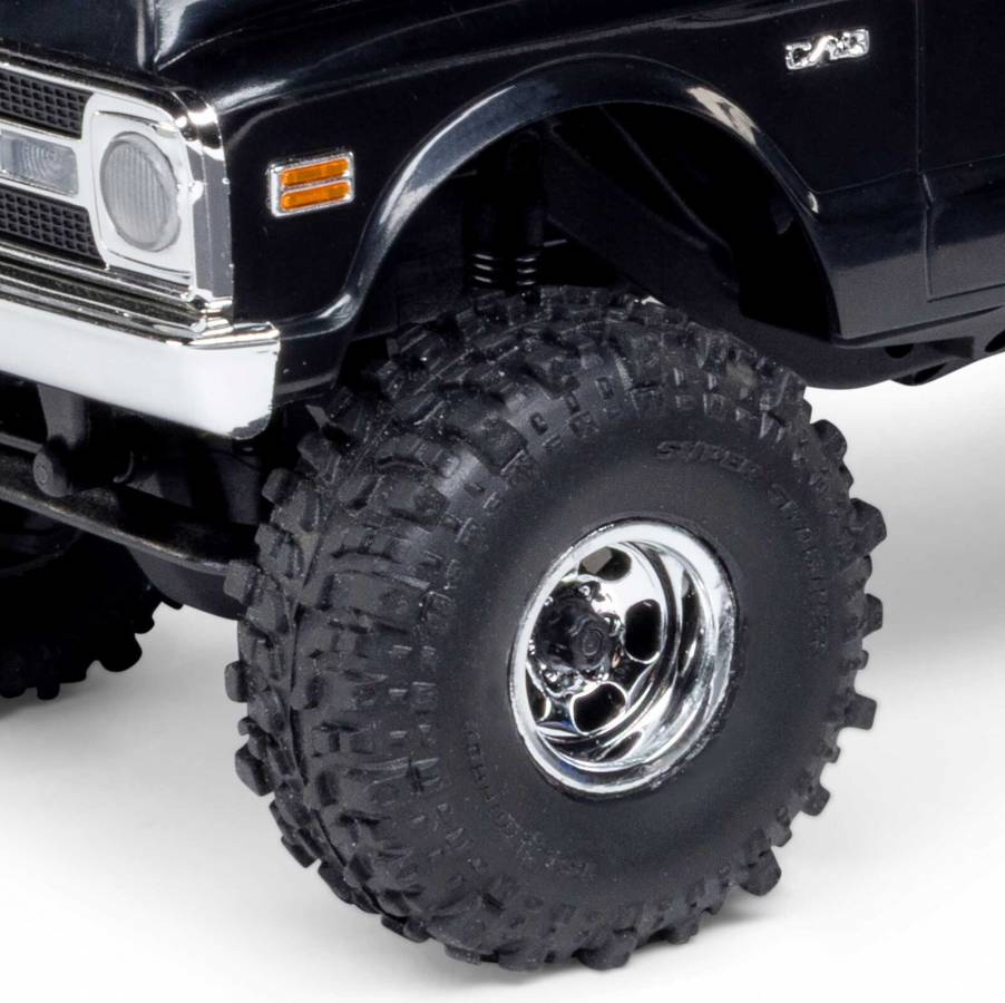 Topping off that trail-ready engineering is a Chevy K10 ABS hard body that proves detailed scale realism can come in any size. An authentic recreation of the full-size truck, the body is complemented by front and rear LEDs and officially licensed Interco Super Swamper tires. These soft compound tires with foam inserts provide all the traction needed for outdoor trail action or for crawling across a desktop, table, or cluttered floor. You can turn any space into your personal Rubicon trail!