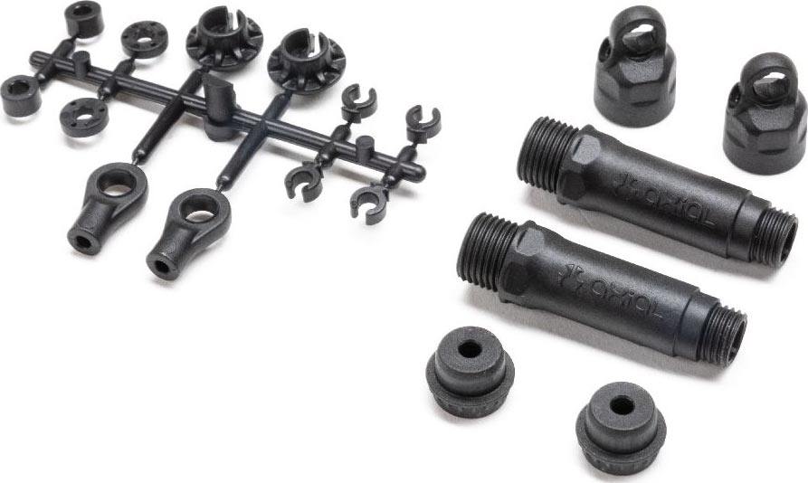 - Included in the bag is (2) Shock spring perches, (2) Lower shock ends, (2) Shock spacers, (4) Bump stops, (2) Shock pistons, (2) Shock caps, (2) Lower caps, (2) Shock bodies