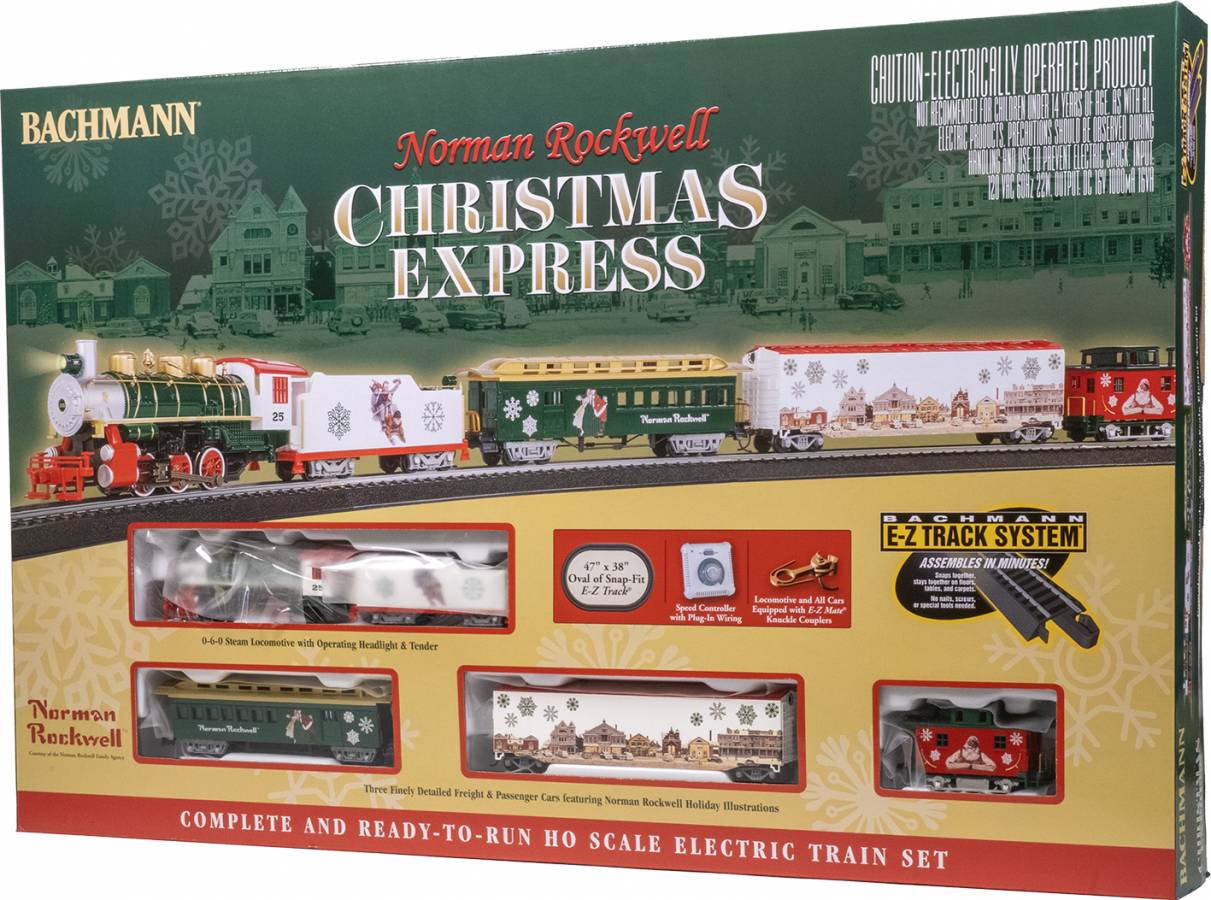 Norman Rockwell Christmas Express Train Set - HO Scale Glide through a winter wonderland with this festive tribute to Norman Rockwell, one of America’s most iconic artists. Featuring a classic 0-6-0 steam locomotive with operating headlight, old-time combine, 50’ boxcar, and bobber caboose, this set depicts several joyful illustrations from the Norman Rockwell collection, including Santa checking his list, children riding a sled, and a classic Christmas depiction of the Main Street of Stockbridge, Rockwell’s Massachusetts home town.