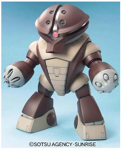 A brand-new MG frame was designed for this unique mobile suit, over which you install the "armor" parts; the joints all feature polycaps and are superbly designed, so that the Acguy can take on just about any pose you've seen it take in the series, including the cute curled-up crouch with its arms around its knees! A one-touch spring switch will release the claws on the right "hand", causing them to pop out quite menacingly! Two sets of "effect parts" are included, too -- one features missiles coming out of the Acguy's left "hand", and the other portrays the aquatic jet-streams from the thrusters under the Acguy's feet.