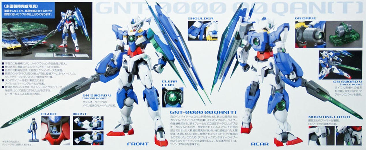 This is the main Mobile Suit from the Gundam 00 movie: Awakening of the Trailblazer. Even though you barely get to see the suit in action in the movie, you can recreate it with this excellent MG offering! The QAN[T] will come with its massive transformable weapon, which even can function as a shield, as well as the GN Sword bits and the GN Sword V. Plenty of translucent green parts, two runners' worth, are included for effects, so this will look really great under a spotlight! Bandai was even nice enough to include a display stand to support the massive GN Sword V in firing mode!
