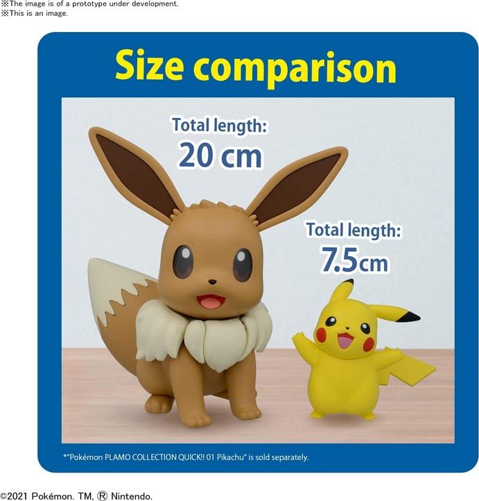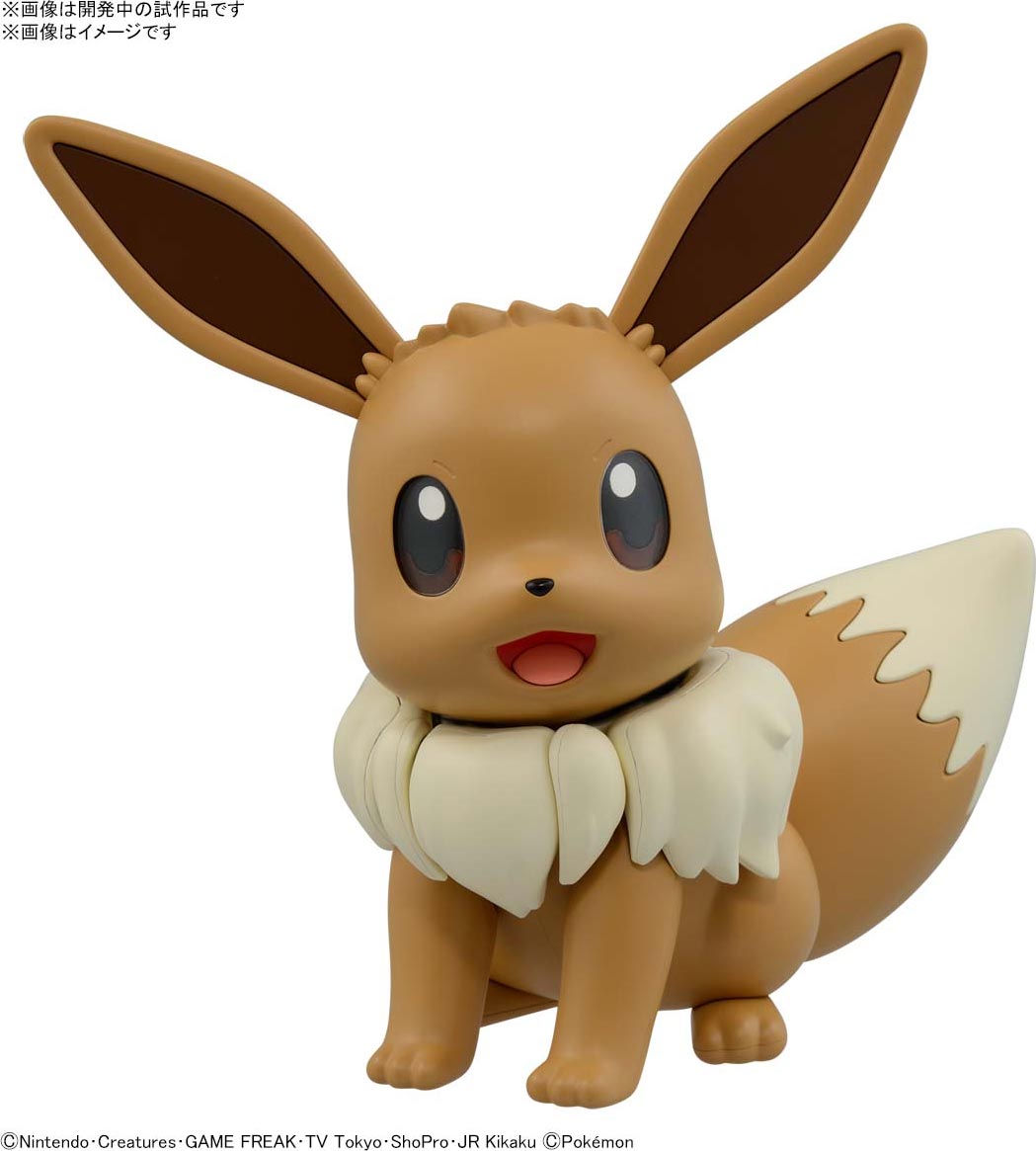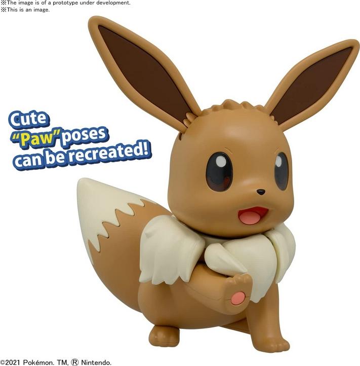 From Pokepla BIG, a large scaled model kit collection that jam-packs the charm of Pokémon, comes Eevee!! 30 parts total, and Approximately 8 inches tall. Color separation has been reproduced with minimal stickers. The adorable eyes have been recreated layering clear parts in the pupils. Expressive poses are possible with the head, ears, and tail that articulates. Careful thought went into selecting the soft material of the paw and tongue. "Shake paw" pose can be created by moving the front legs and fur around the neck.