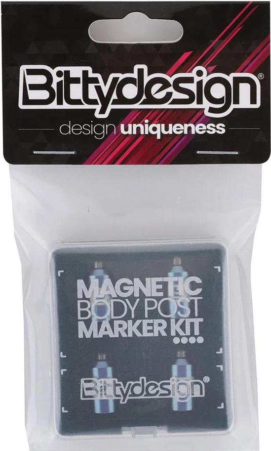 The Bittydesign Large Scale Magnetic Body Post Marker Kit is a great tool to help get your body post holes lined up perfectly. Anyone who has mounted a body - especially a painted body - knows how difficult it is to get the post holes lined up perfectly. This high powered magnet kit helps you find the position of the body posts, dramatically simplifying the hole marking process. The kit is optimized to be used on all the 1/8 to 1/5 scale size Off and On-Road cars and is a must have for enthusiasts that demand perfection.