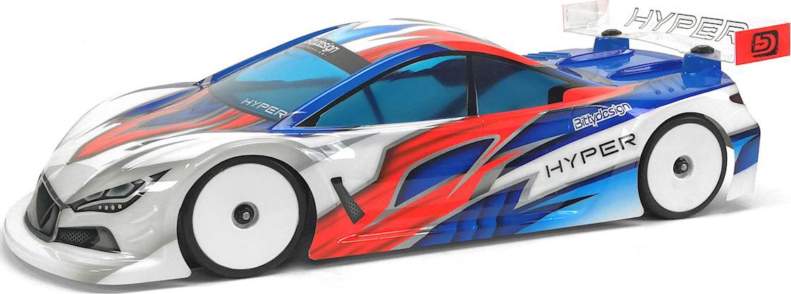 HYPER is a touring body shell with a breathtaking look that follows the new market trend of high-downforce bodies but with the lowest possible center of gravity; the large front splitter, the crushed and lowered bonnet, the advanced roof and tapered as much as possible in the rear, all elements that together with the design of the rear end of the body have been designed to generate stability and maximum traction making the model balanced and easy to to drive.