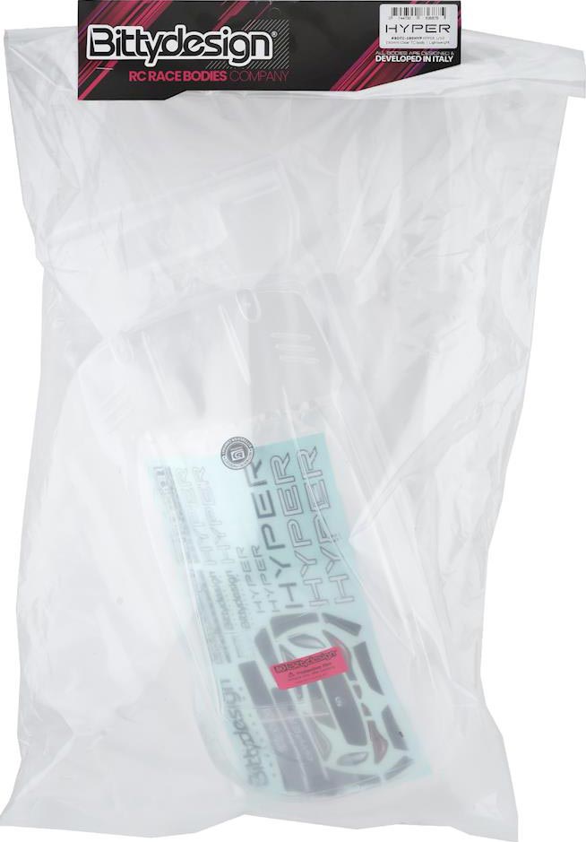 This is the 190mm Bittydesign HYPER 1/10 Touring Car Body in Clear lightweight lexan material. The HYPER body shell represents a new reality and set-up option for drivers all around the world who always push to obtain the best result with their models and that are willing to try and use what is best for their driving style.