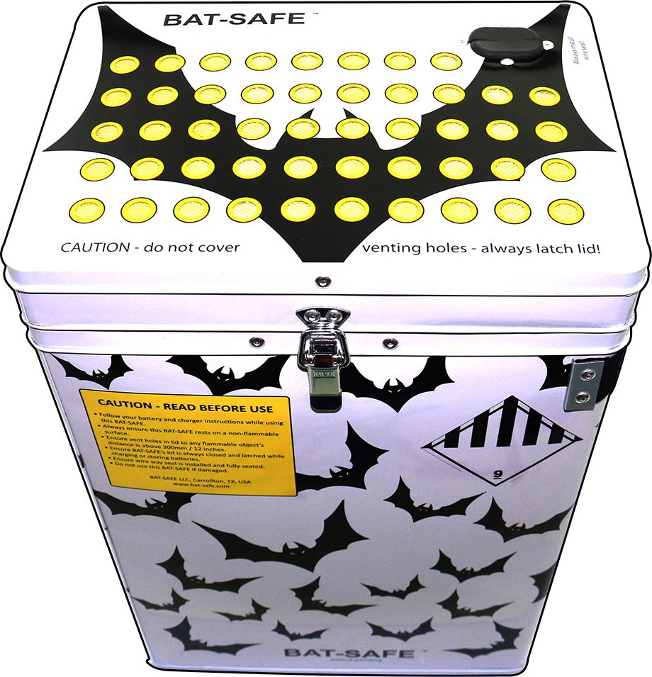 BAT-SAFE is lightweight, easy to use and inexpensive. It has a magnetic attached charger stand, a handle for easy transportation, a fire proof lid seal and wire ways allow access for charging wires.