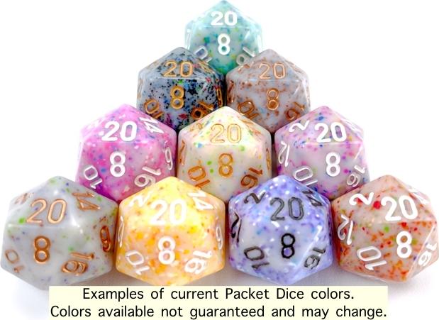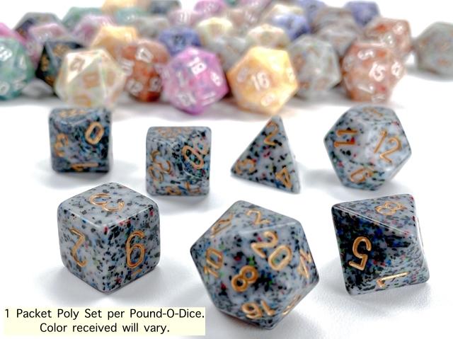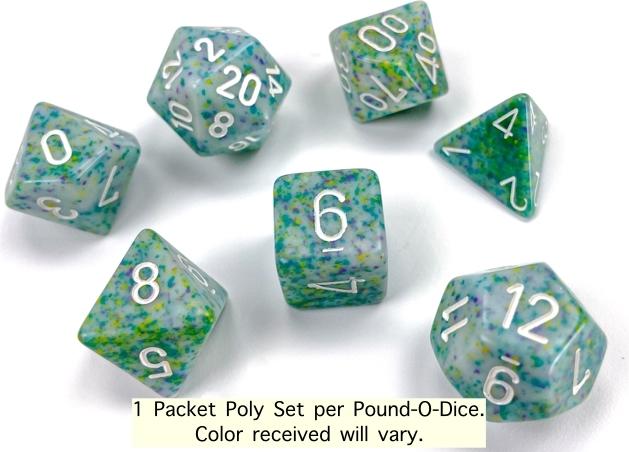 Looking for an inexpensive way to increase your dice collection? The Pound-O-Dice™ is the perfect solution. Each pound has approximately 100 dice in assorted shapes and colors with quantities weighted in favor of d6's, d10's, and d20's. Also included is a full 7-die set randomly selected, specially made polyhedral dice that are only available in this product.