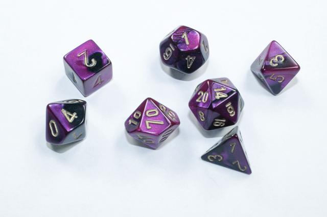 Contains 7 Gemini Black-Purple Dice with gold numbers in the following Shapes:
