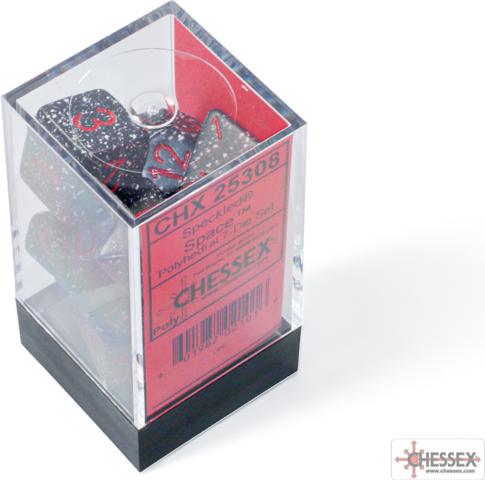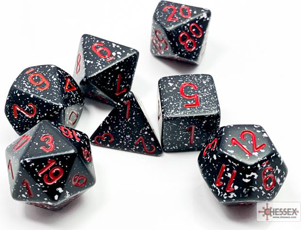 This set contains 7 Speckled Space dice with red numbers with the following shapes: