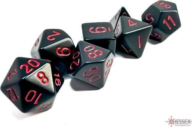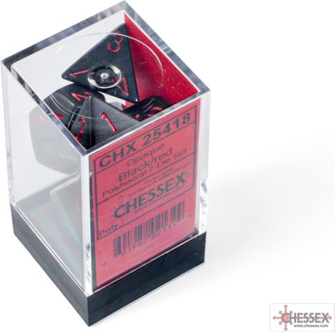 This set contains 7 Opaque Black dice with red numbers with the following shapes: