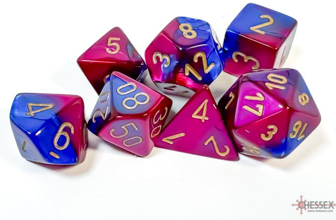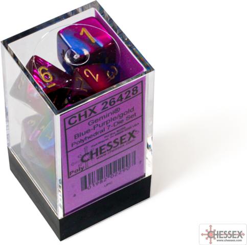 This set contains 7 Gemini Blue-Purple dice with gold numbers with the following shapes: