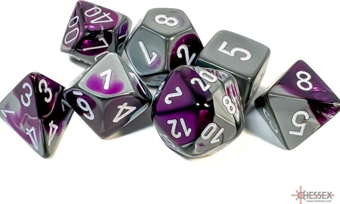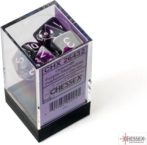 This set contains 7 Gemini Purple-Steel dice with white numbers with the following shapes: