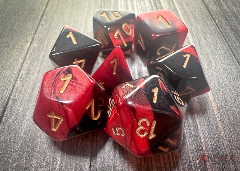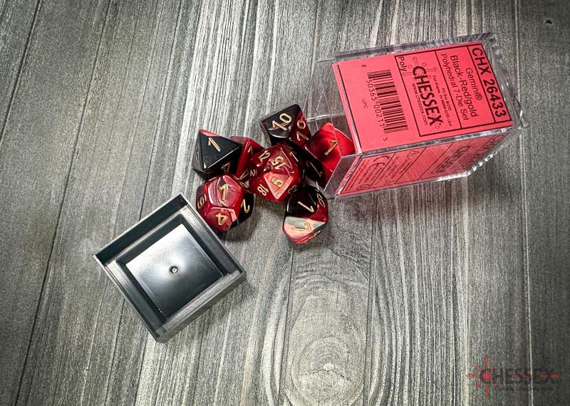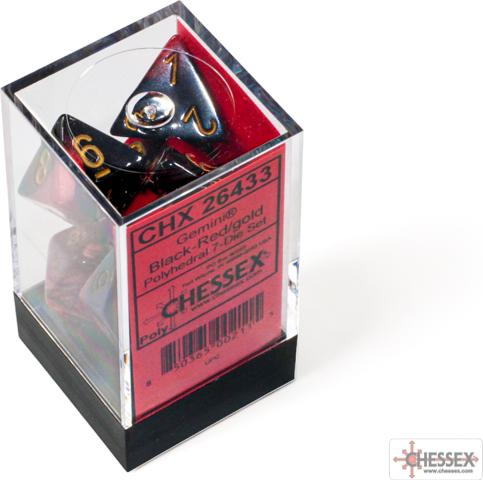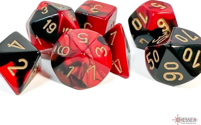 This set contains 7 Gemini Black-Red dice with gold numbers with the following shapes: