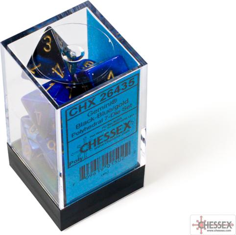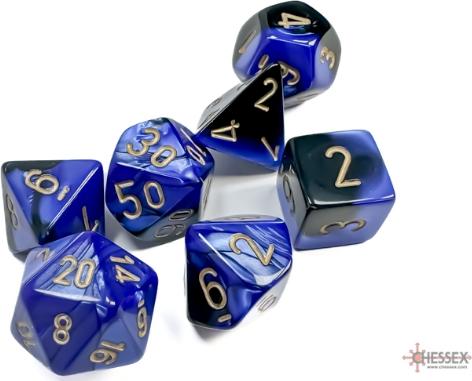 This set contains 7 Gemini Black-Blue dice with gold numbers with the following shapes: