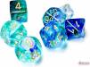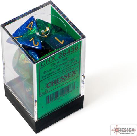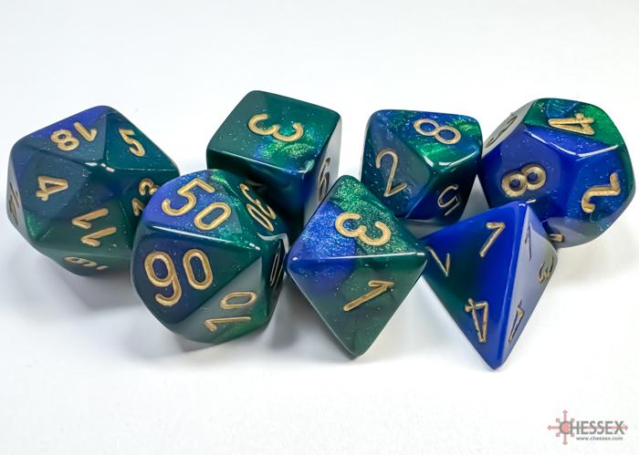 This set contains 7 Gemini Blue-Green dice with gold numbers with the following shapes: