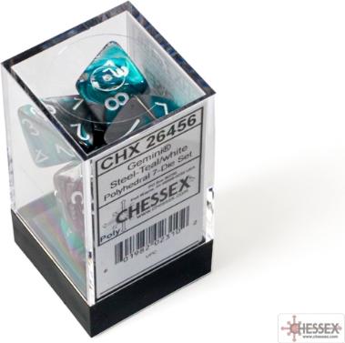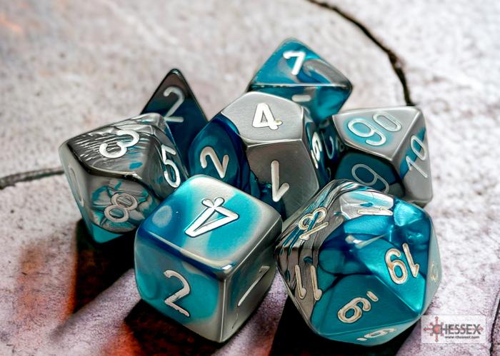 This set contains 7 Gemini Steel-Teal dice with white numbers with the following shapes: