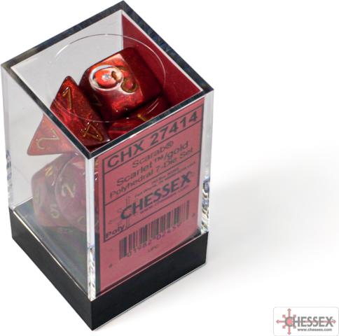 This set contains 7 Scarab Scarlet dice with gold numbers with the following shapes: