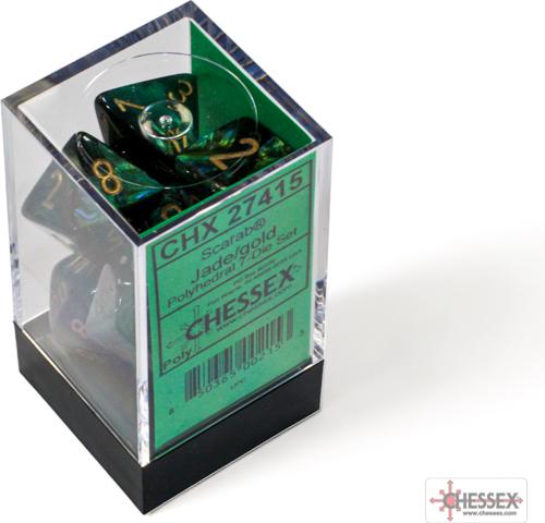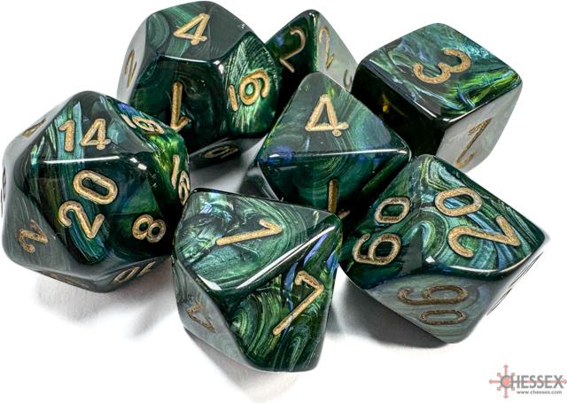 This set contains 7 Scarab Jade dice with gold numbers with the following shapes: