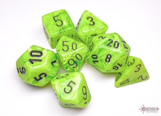 This set contains 7 Vortex Bright Green dice with black numbers with the following shapes: