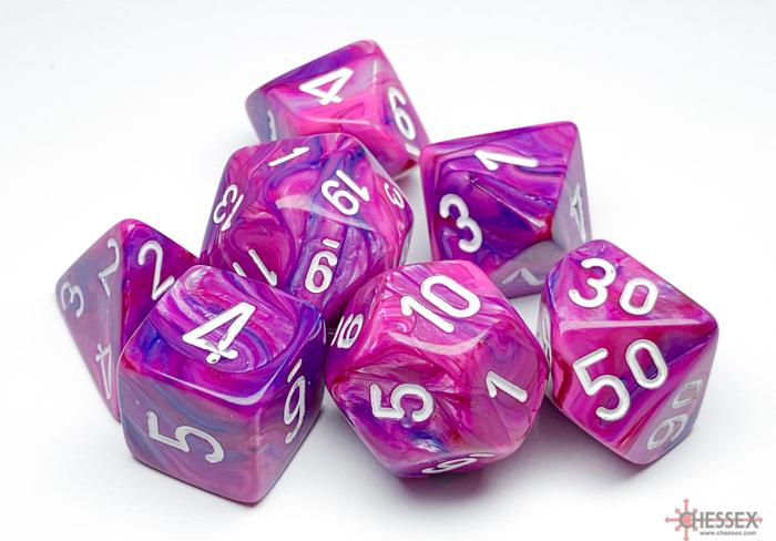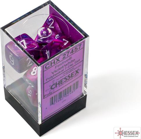 This set contains 7 Festive Violet dice with white numbers with the following shapes: