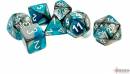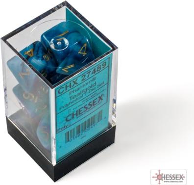 This set contains 7 Phantom Teal dice with gold numbers with the following shapes: