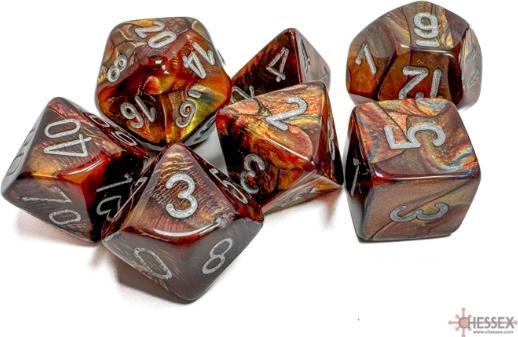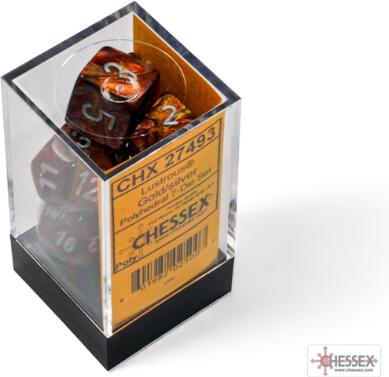 This set contains 7 Lustrous Gold dice with silver numbers with the following shapes: