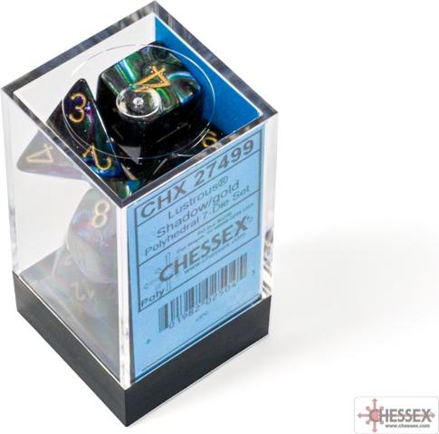This set contains 7 Lustrous Shadow dice with gold numbers with the following shapes: