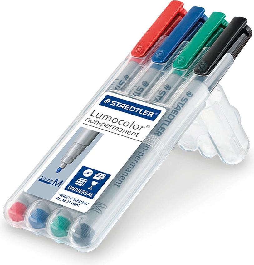Staedtler-Mars (Chessex) Lumocolor Markers write on nearly all surfaces. Marks on most plastics, metal and glass. Water soluble. Wipes off with damp towel. Series 315 set of four: Black, Red, Blue and Green. 1.0mm tip. Perfect for use with any reusable combat mats.