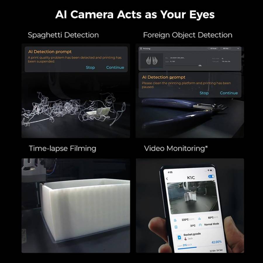 - Smart AI Function: Creality K1C equips observant AI Camera: Recognize spaghetti failure, foreign matter, debris, etc. and support real-time monitoring and time-lapse filming