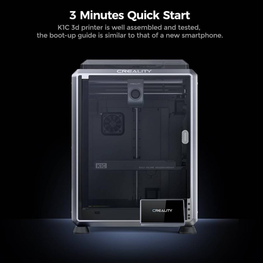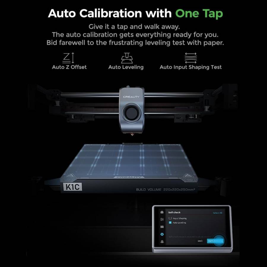 - Convenient Operation: Creality K1C is well assembled and tested before shipment. After unboxing, it is ready for plug and play. The boot-up guide is similar to that of a new smartphone. 3 minutes from unboxing to powering on, you can start print quickly. Also, the auto calibration help you to print easily. Auto Z offset, auto leveling and auto input shaping test, all of the auto operation save your time largly. Give it a tap and walk away. The auto calibration gets everything ready for you. Bid farewell to the frustrating leveling test with paper