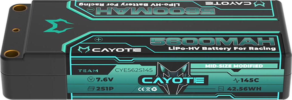 The Cayote 2S 145C Mid-Size LiHV Battery is built for racers who demand maximum power and consistency on the track. Designed longer than a shorty pack but more compact than a full-size stick pack, it offers an ideal balance of weight distribution and runtime. With high-voltage LiHV chemistry and an impressive 145C discharge rate, this battery delivers strong punch and sustained performance. It’s competition-ready and approved by major racing organizations worldwide.