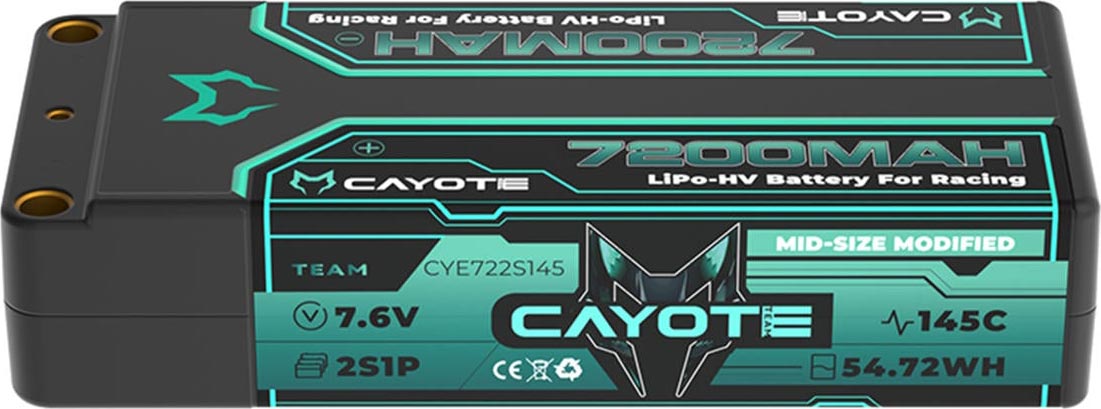 The Cayote 2S 145C Mid-Size LiHV Battery is built for racers who demand maximum power and consistency on the track. Designed longer than a shorty pack but more compact than a full-size stick pack, it offers an ideal balance of weight distribution and runtime. With high-voltage LiHV chemistry and an impressive 145C discharge rate, this battery delivers strong punch and sustained performance. It’s competition-ready and approved by major racing organizations worldwide.