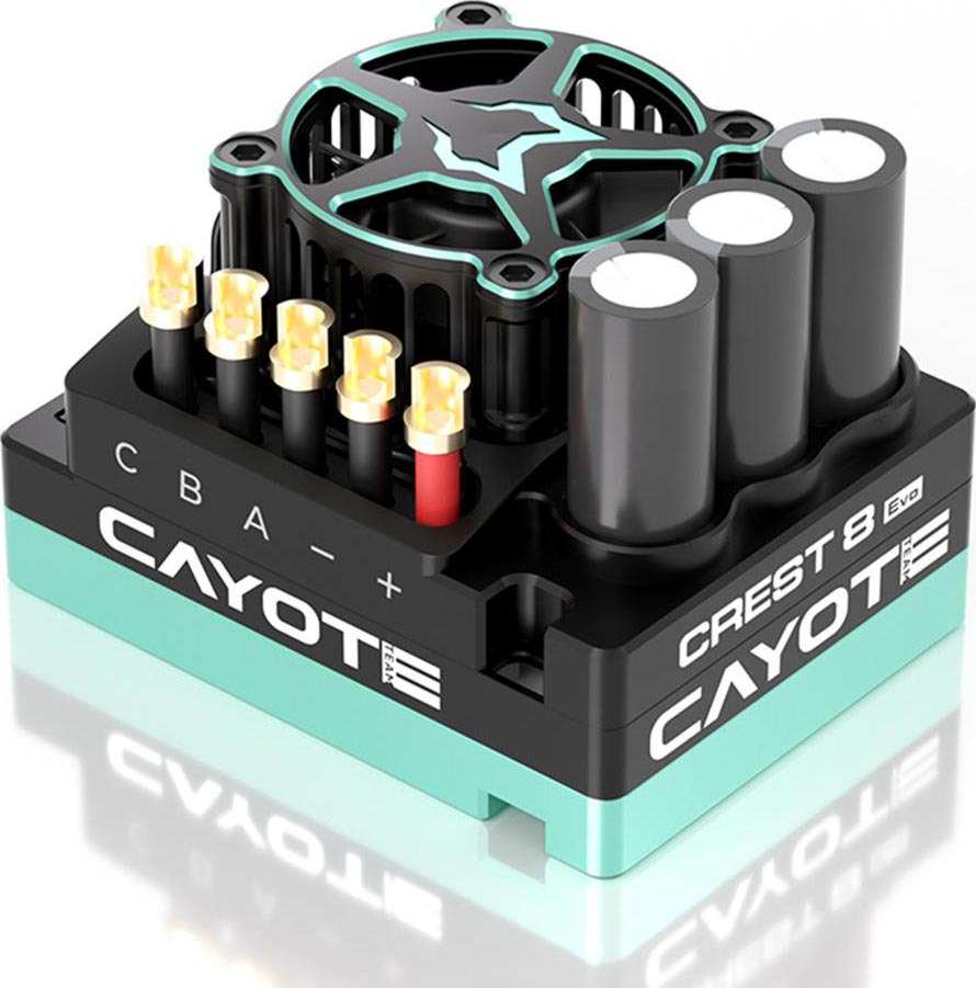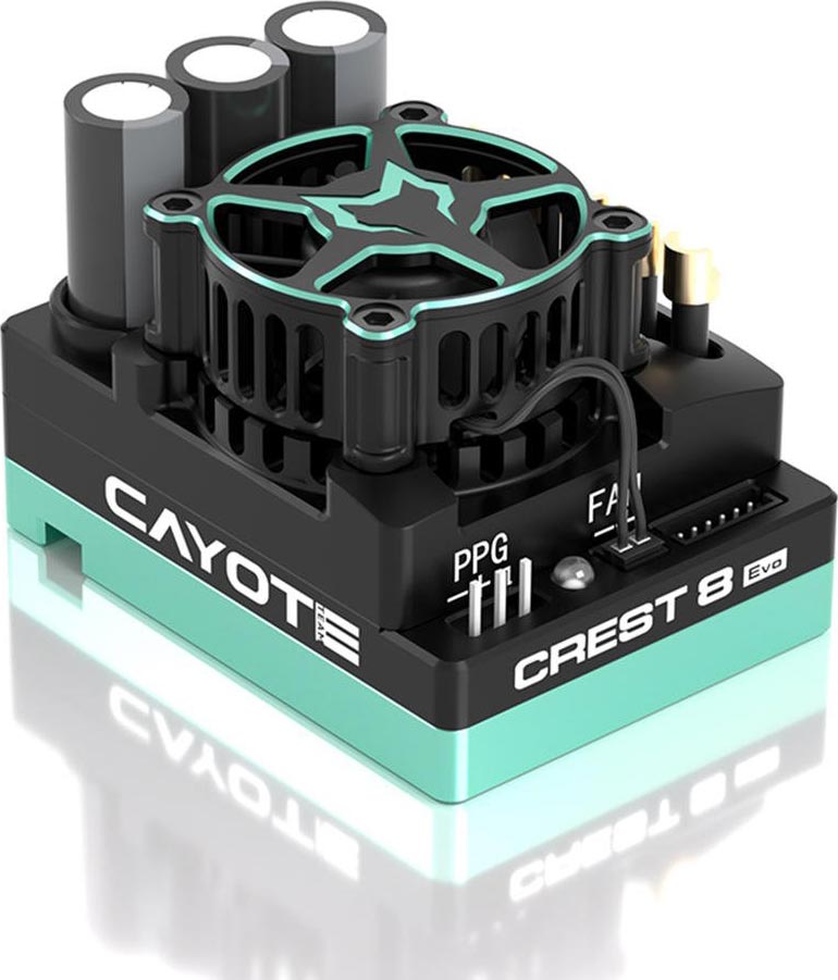The Cayote Crest 8 Evo 1/8 200A Sensored Brushless ESC is engineered for high-performance RC applications, delivering precise power control, reliability, and up to 10% more peak power for an extra edge on the track. Built with reverse polarity protection, it safeguards your system from wiring errors while maintaining consistent performance. With advanced cooling technology, customizable settings, and an included glitch buster to smooth out voltage fluctuations, the Crest 8 Evo adapts seamlessly to any racing condition. Whether you're chasing podium finishes or pushing through rugged terrain, this ESC provides the control, protection, and durability demanded by serious competitors.