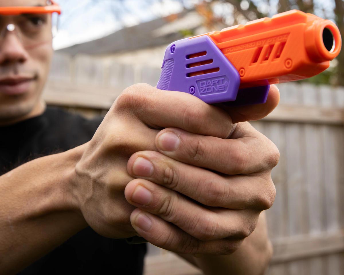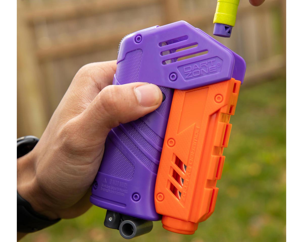 This manual dart blaster comes complete with 10 Nitroshot+ Darts, but it’s also compatible with a range of other Dart Zone and Nerf darts. (Check the Dart Compatibility list on this page to see which ones.) In fact, the versatile Dart Zone Max Solo can blast a single half-length dart, two half-length darts or even a full-length dart.