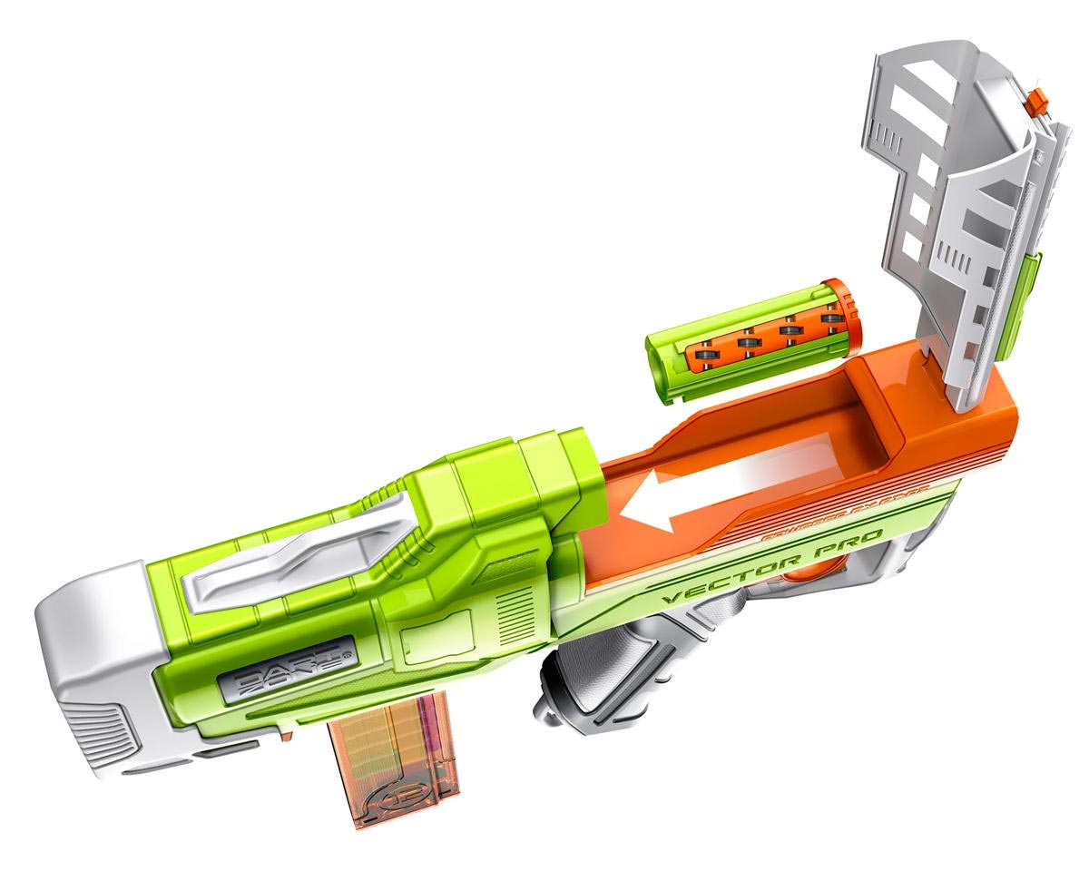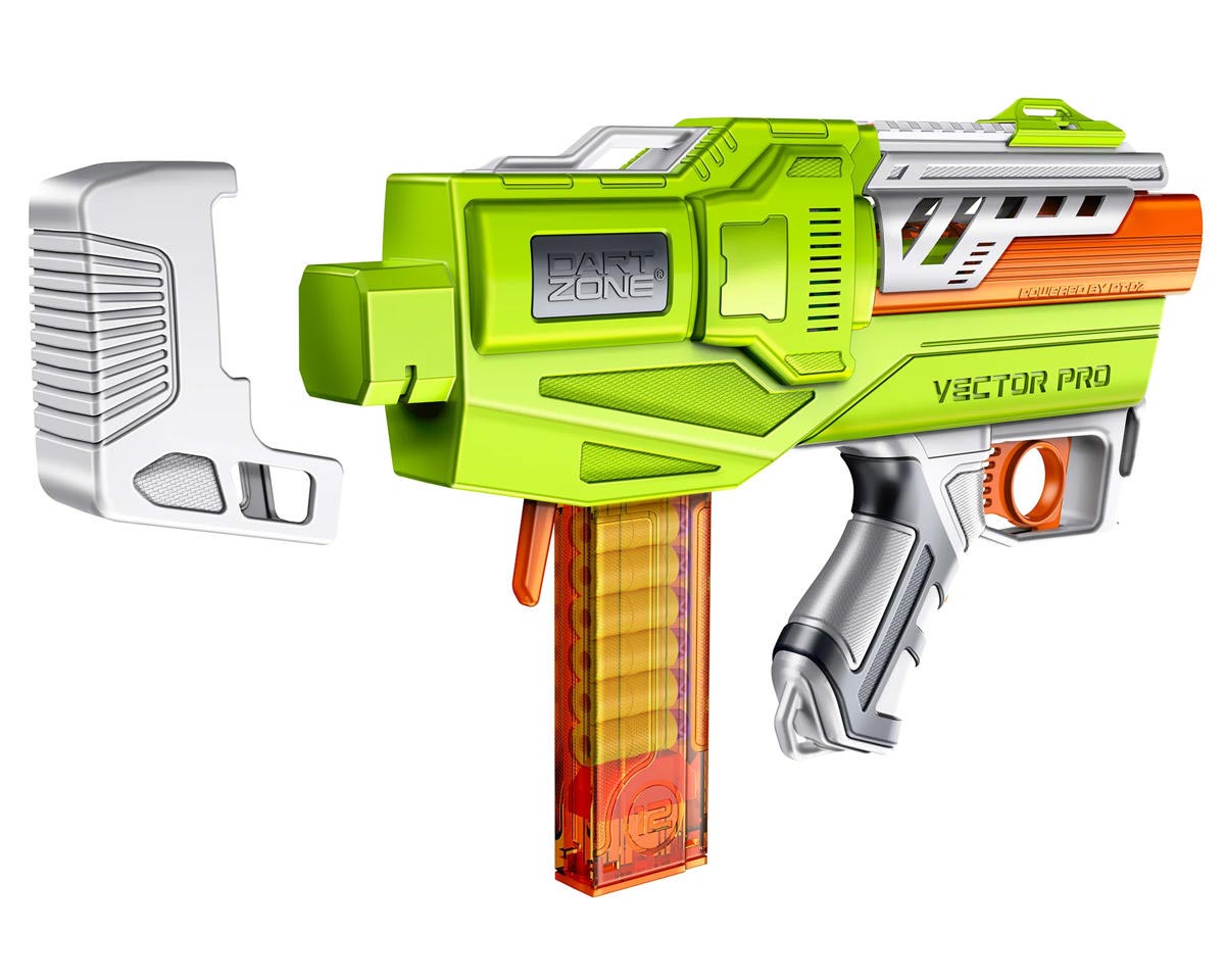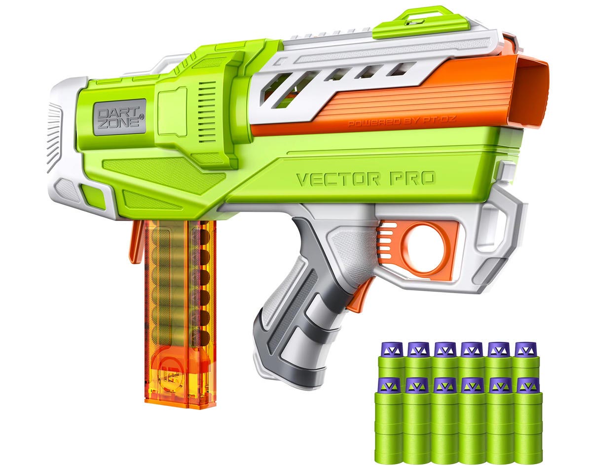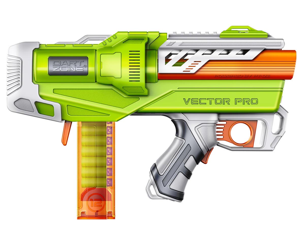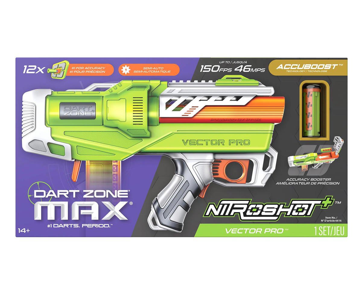 Take your game to the next level with the Dart Zone Max Nitroshot+ Vector Pro, a compact powerhouse built for hobbyists and competitive players. The semi-auto flywheel system delivers rapid-fire blasting at speeds up to 150 FPS, while the integrated BCAR accuracy booster ensures every shot hits with unmatched precision. Its sleek, unique design blends portability with high performance, and a hidden stock mount lets you attach compatible stocks for a customized fit. Equipped with adjustable tactical sights, the Vector Pro adapts to your play style, whether you’re dominating close combat or lining up long-range targets. Each set includes a 12-round half-length magazine, 12 Nitroshot+ Half-Length Darts designed for maximum accuracy, and protective eyewear to keep you ready for battle.