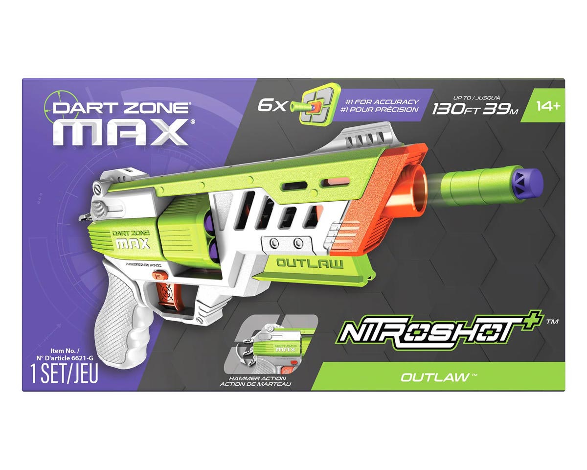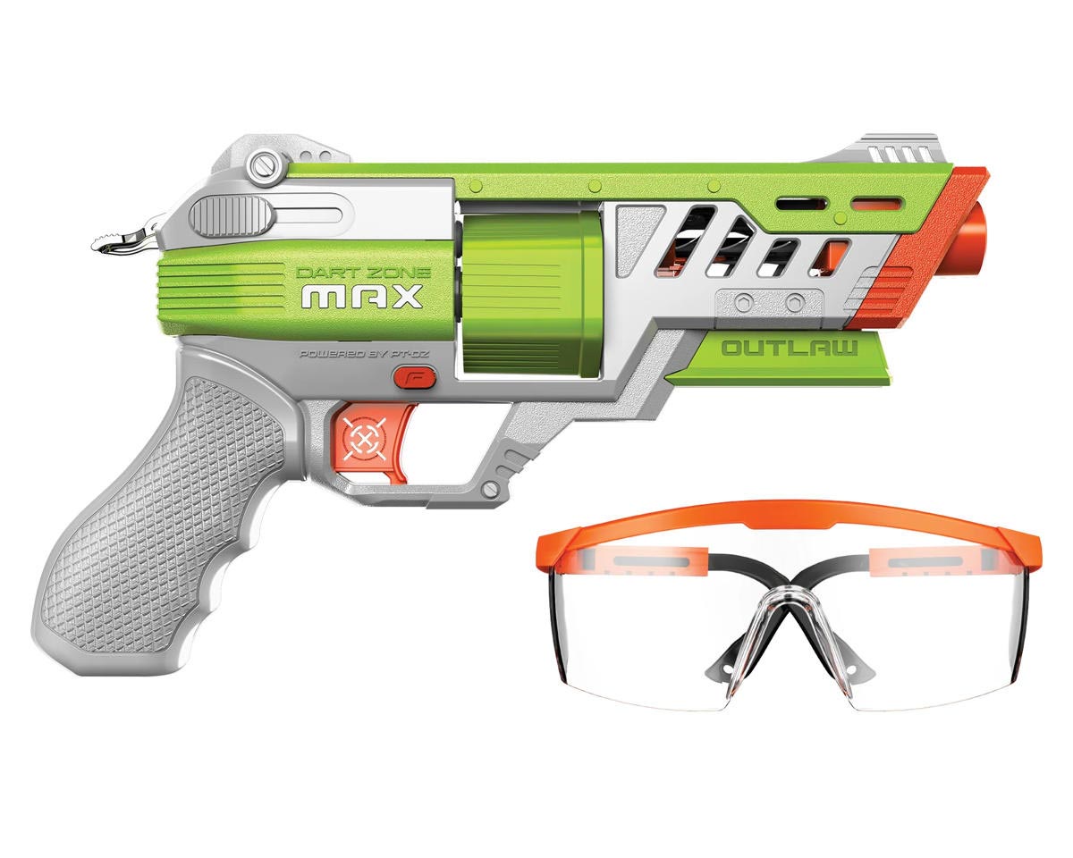 Load up with the included 6 half-length Dart Zone Nitroshot+ Half-Length Darts and fire with unmatched accuracy, reaching distances of up to 130 feet. The blaster’s ergonomic design includes integrated tactical sights for pinpoint precision and a sleek silhouette in bold Green or Blue finishes. Safety is built in, with a dependable lock mechanism and Max Eyewear Gear included for ultimate peace of mind. The Dart Zone Max Nitroshot+ Outlaw is your ultimate companion for dominating the foam dart battlefield.