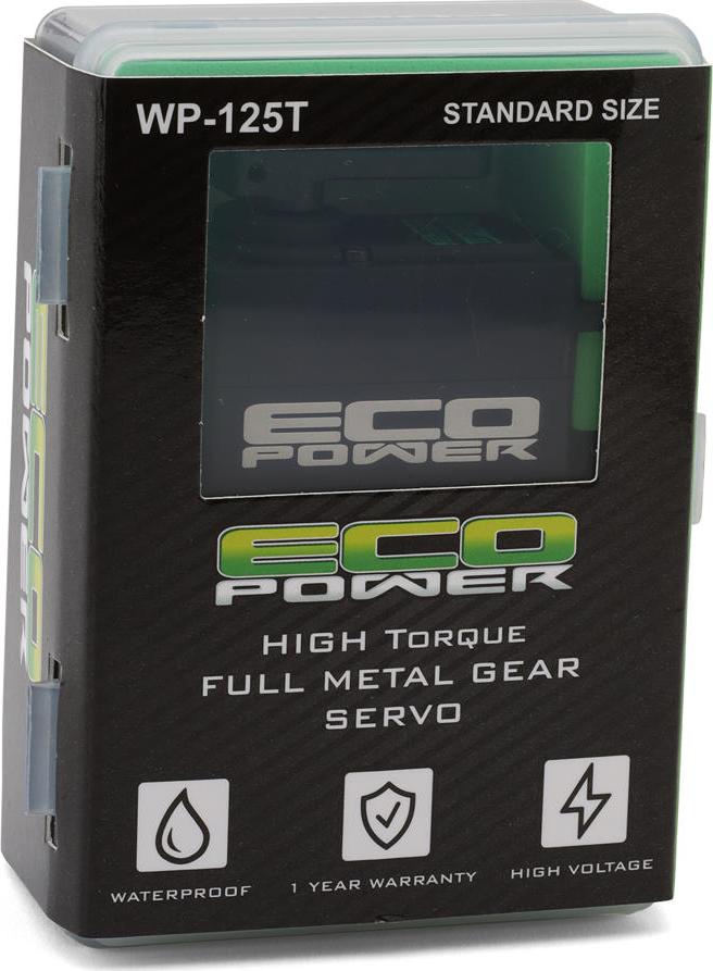 The EcoPower WP125T Waterproof High Torque Metal Gear Digital Servo is engineered to deliver dependable steering performance for 1/10 4WD RC vehicles. Designed for demanding off-road conditions, it combines waterproof protection, durable metal gears, and strong torque output to maintain smooth, consistent control. Compatible with popular platforms from Traxxas®, ARRMA®, Axial®, Losi®, and others, it serves as a reliable upgrade for drivers seeking improved handling and responsiveness. With enhanced durability and refined performance over the previous WP120T, this servo offers long-lasting value for a wide range of builds.