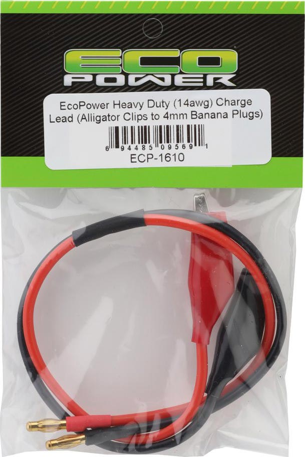 The EcoPower Heavy Duty Alligator Clips to 4mm Banana Plugs Charge Lead offers a strong, adaptable solution for charging a wide range of batteries. Built with flexible 14AWG silicone wire, it ensures efficient power transfer and durability under high current loads. Featuring secure alligator clips on one end and 4mm banana plugs on the other, this lead provides a reliable connection for car racing packs and other batteries with hard-soldered terminals.