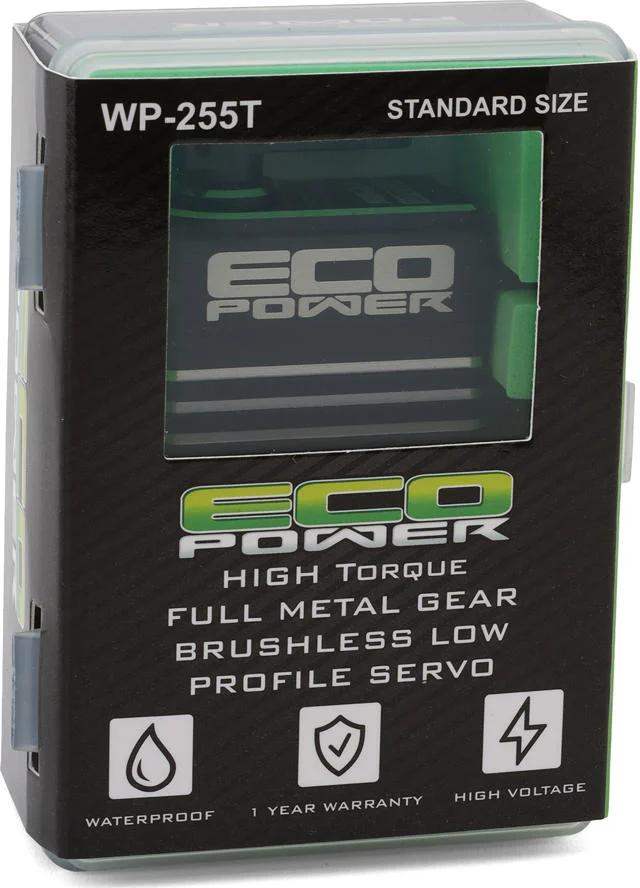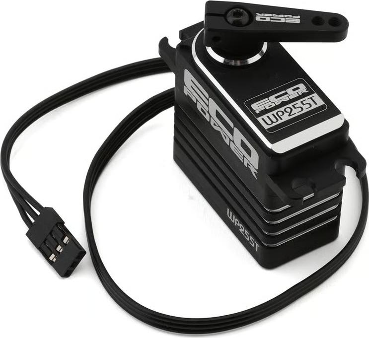 The EcoPower WP255T Low Profile High Torque Metal Gear Brushless Servo delivers exceptional power, durability, and efficiency for 1/7 and 1/8 crawlers, bashers, and other heavy-duty builds. With 681 ounce-inches of torque and a 0.12-second transit speed at 7.4V, it easily turns large 2.2-inch tires and handles demanding terrain without hesitation. A waterproof gasket system protects the electronics up to one meter, while a steel geartrain and aluminum heat sink case ensure long-lasting performance. As a refined evolution of the WP250T, this servo offers brushless smoothness, rugged strength, and premium-level specs at a budget-friendly price.