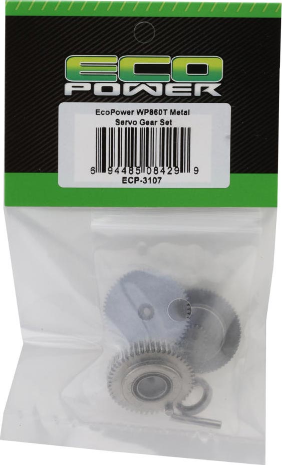 EcoPower WP860T (ECP860T) Metal Servo Gear Set. This replacement gear set is intended for the EcoPower WP860T. Package includes four servo gears, one bushing and two alignment pins.